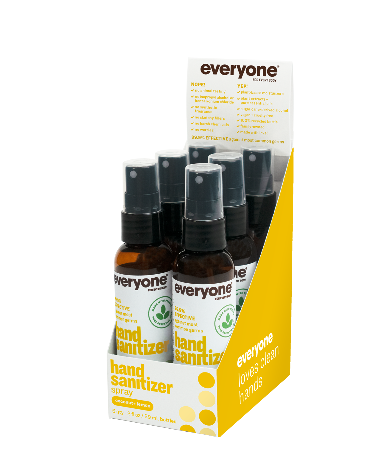 Everyone Hand Sanitizer combines non-GMO sugarcane-derived alcohol with essential oil scents to keep hands clean and refreshed. It effectively kills 99.9% of most common germs on-the-go without drying out your skin or leaving a sticky residue — just clean, happy hands for everyone.