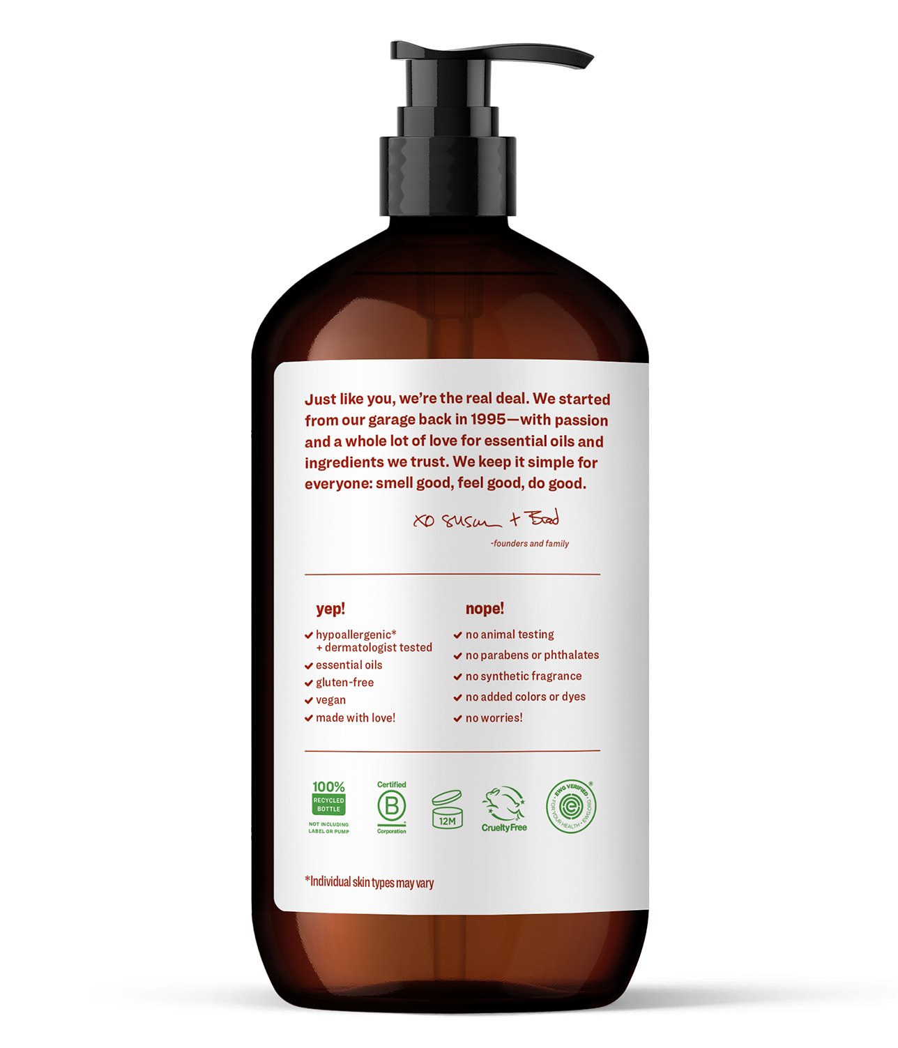 Water, Cocamidopropyl Hydroxysultaine, Sodium Coco-Sulfate, Caprylyl/Capryl Glucoside, Sodium Chloride, Coco-Glucoside, Panthenol, EO® Essential Oil Blend [Juniperus Virginiana Oil, Lavandula Hybrida Oil, Citrus Aurantium Dulcis (Orange) Peel Oil], EO® Organic Herbal Blend [Organic Aloe Barbadensis Leaf Juice, Organic Chamomilla Recutita (Matricaria) Flower Extract, Organic Calendula Officinalis Flower Extract and Organic Camellia Sinensis Leaf Extract], Glycerin, Citric Acid, Sodium Phytate, Phenoxyethanol, Benzyl Alcohol, Potassium Sorbate, Tocopherol, †Limonene