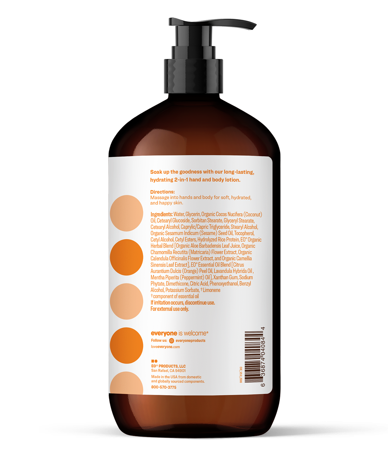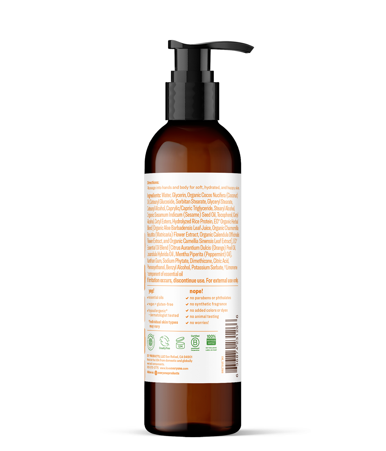 Water, Glycerin, Organic Cocos Nucifera (Coconut) Oil, Cetearyl Glucoside, Sorbitan Stearate, Glyceryl Stearate, Cetearyl Alcohol, Caprylic/Capric Triglyceride, Stearyl Alcohol, Organic Sesamum Indicum (Sesame) Seed Oil, Tocopherol, Cetyl Alcohol, Cetyl Esters, Hydrolyzed Rice Protein, EO® Organic Herbal Blend [Organic Aloe Barbadensis Leaf Juice, Organic Chamomilla Recutita (Matricaria) Flower Extract, Organic Calendula Officinalis Flower Extract, and Organic Camellia Sinensis Leaf Extract], EO® Essential Oil Blend [Citrus Aurantium Dulcis (Orange) Peel Oil, Lavandula Hybrida Oil , Mentha Piperita (Peppermint) Oil], Xanthan Gum, Sodium Phytate, Dimethicone, Citric Acid, Phenoxyethanol, Benzyl Alcohol, Potassium Sorbate, †Limonene
