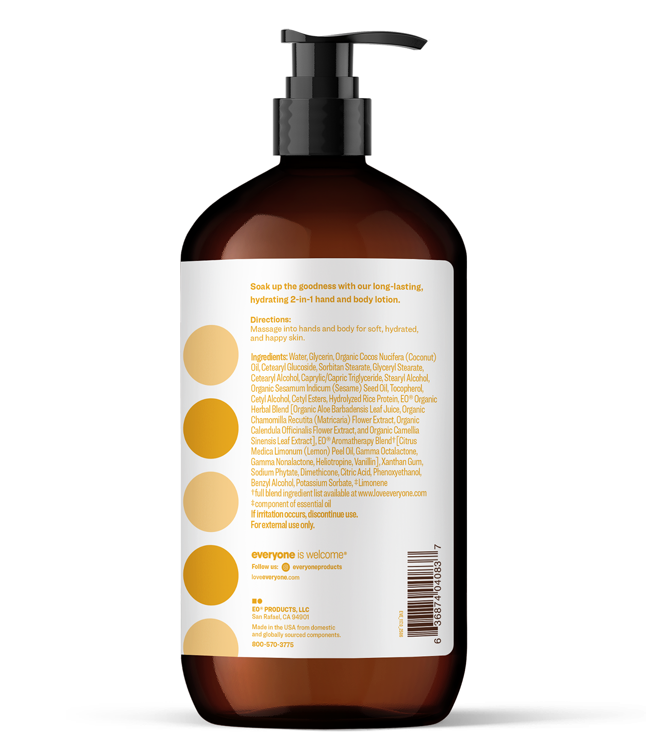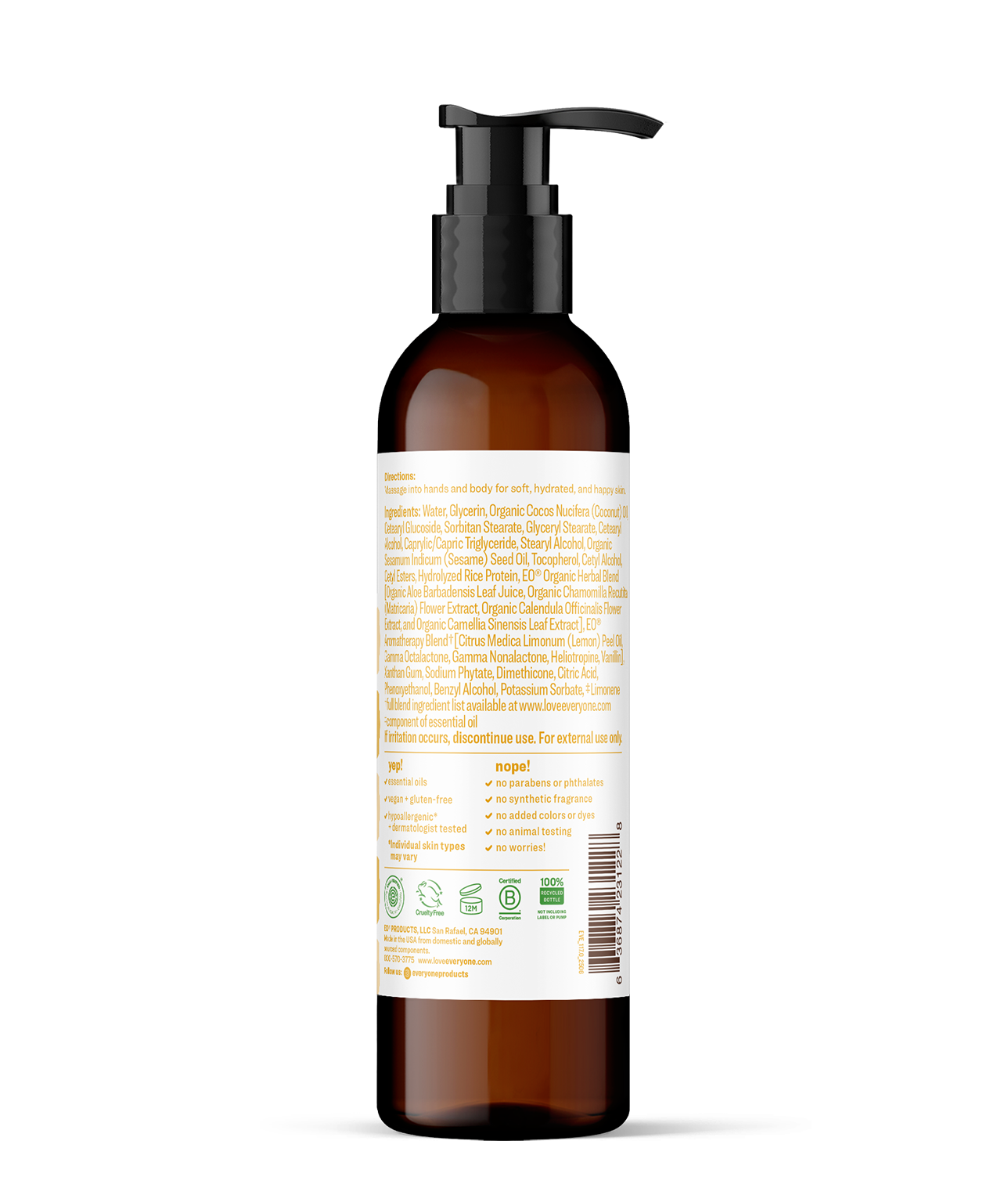 Water, Glycerin, Organic Cocos Nucifera (Coconut) Oil, Cetearyl Glucoside, Sorbitan Stearate, Glyceryl Stearate, Cetearyl Alcohol, Caprylic/Capric Triglyceride, Stearyl Alcohol, Organic Sesamum Indicum (Sesame) Seed Oil, Tocopherol, Cetyl Alcohol, Cetyl Esters, Hydrolyzed Rice Protein, EO® Organic Herbal Blend [Organic Aloe Barbadensis Leaf Juice, Organic Chamomilla Recutita (Matricaria) Flower Extract, Organic Calendula Officinalis Flower Extract, and Organic Camellia Sinensis Leaf Extract], EO® Aromatherapy Blend[Citrus Medica Limonum (Lemon) Peel Oil, Ethanol, Gamma Octalactone, Gamma Nonalactone, Heliotropine, Vanillin], Xanthan Gum, Sodium Phytate, Dimethicone, Citric Acid, Phenoxyethanol, Benzyl Alcohol, Potassium Sorbate, *Limonene