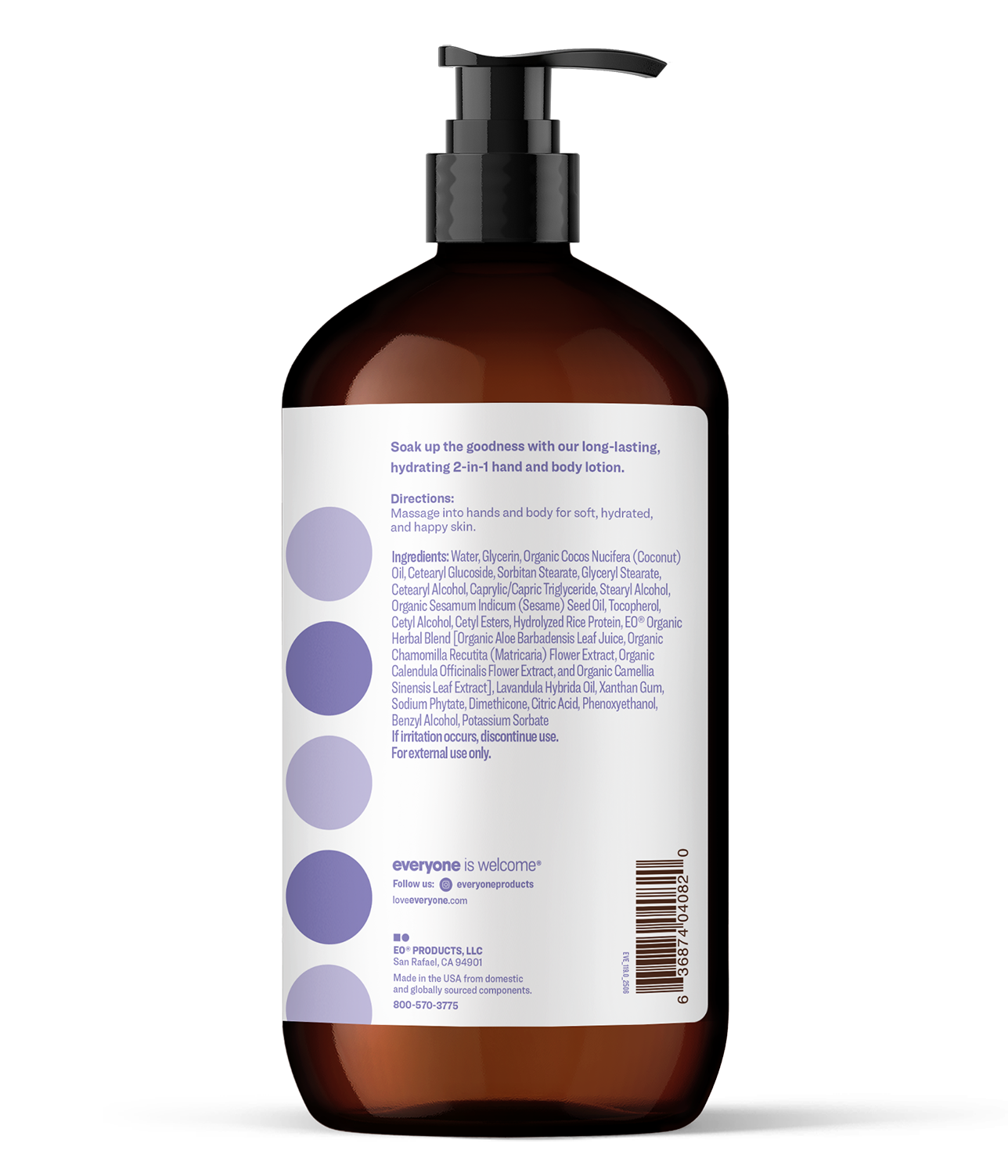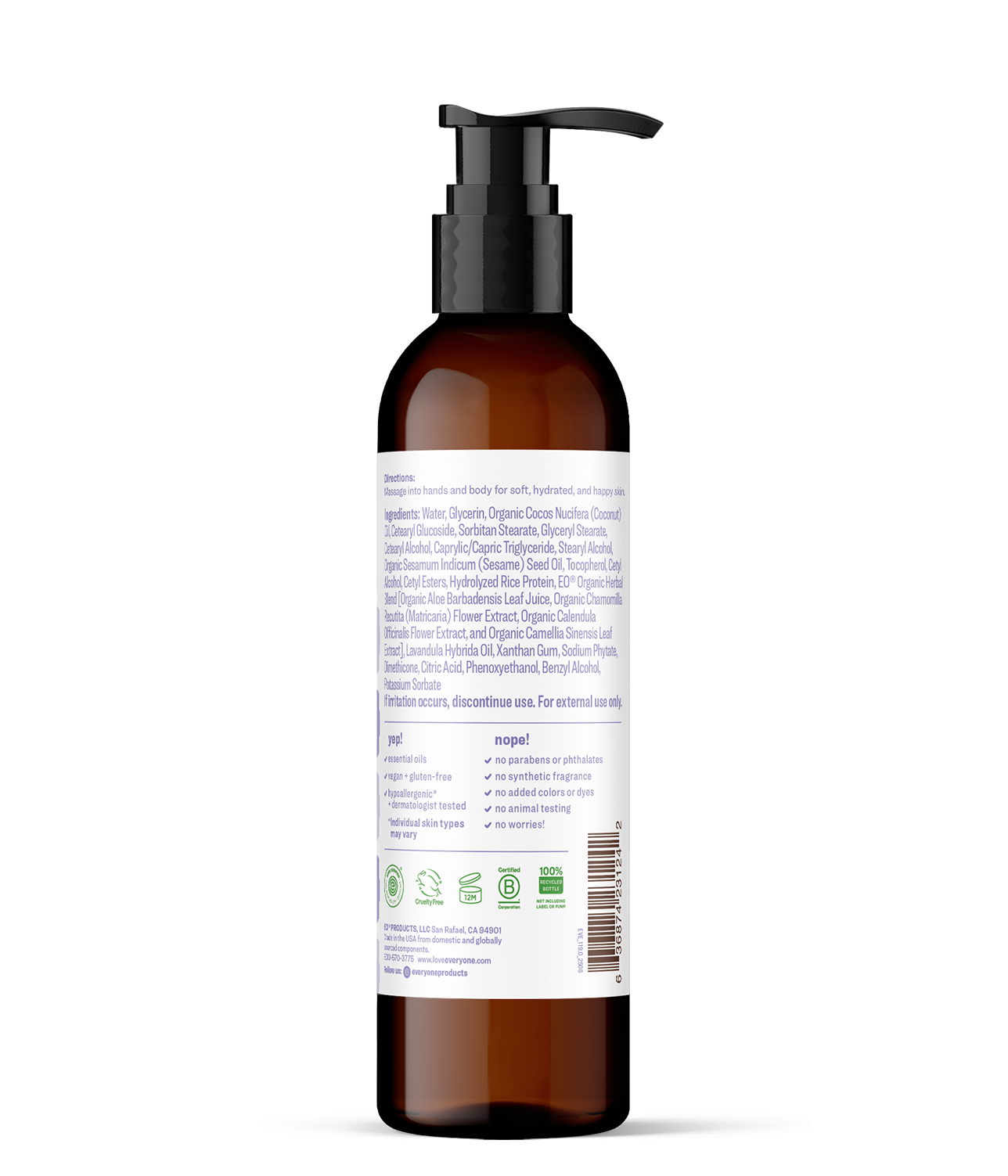 Water, Glycerin, Organic Cocos Nucifera (Coconut) Oil, Cetearyl Glucoside, Sorbitan Stearate, Glyceryl Stearate, Cetearyl Alcohol, Caprylic/Capric Triglyceride, Stearyl Alcohol, Organic Sesamum Indicum (Sesame) Seed Oil, Tocopherol, Cetyl Alcohol, Cetyl Esters, Hydrolyzed Rice Protein, EO® Organic Herbal Blend [Organic Aloe Barbadensis Leaf Juice, Organic Chamomilla Recutita (Matricaria) Flower Extract, Organic Calendula Officinalis Flower Extract, and Organic Camellia Sinensis Leaf Extract], Lavandula Hybrida Oil, Xanthan Gum, Sodium Phytate, Dimethicone, Citric Acid, Phenoxyethanol, Benzyl Alcohol, Potassium Sorbate