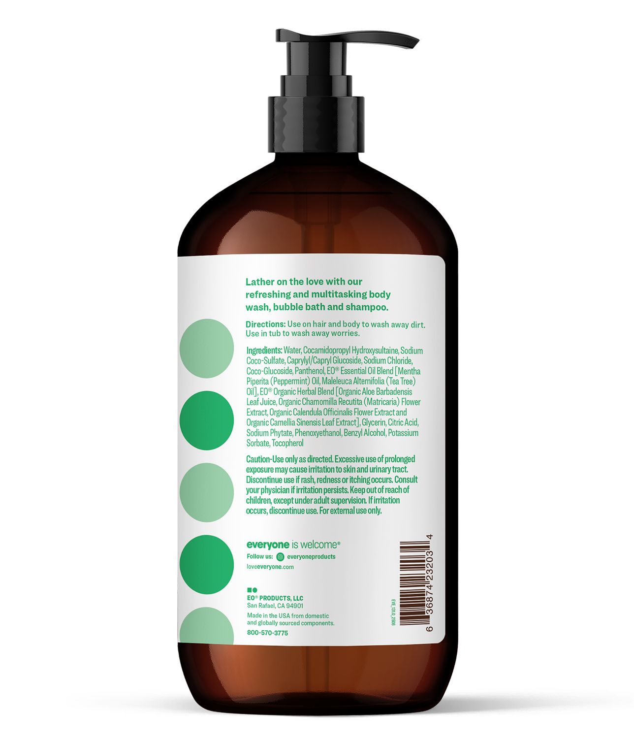Water, Cocamidopropyl Hydroxysultaine, Sodium Coco-Sulfate, Caprylyl/Capryl Glucoside, Sodium Chloride, Coco-Glucoside, Panthenol, EO® Essential Oil Blend [Mentha Piperita (Peppermint) Oil, Maleleuca Alternifolia (Tea Tree) Oil], EO® Organic Herbal Blend [Organic Aloe Barbadensis Leaf Juice, Organic Chamomilla Recutita (Matricaria) Flower Extract, Organic Calendula Officinalis Flower Extract and Organic Camellia Sinensis Leaf Extract], Glycerin, Citric Acid, Sodium Phytate, Phenoxyethanol, Benzyl Alcohol, Potassium Sorbate, Tocopherol