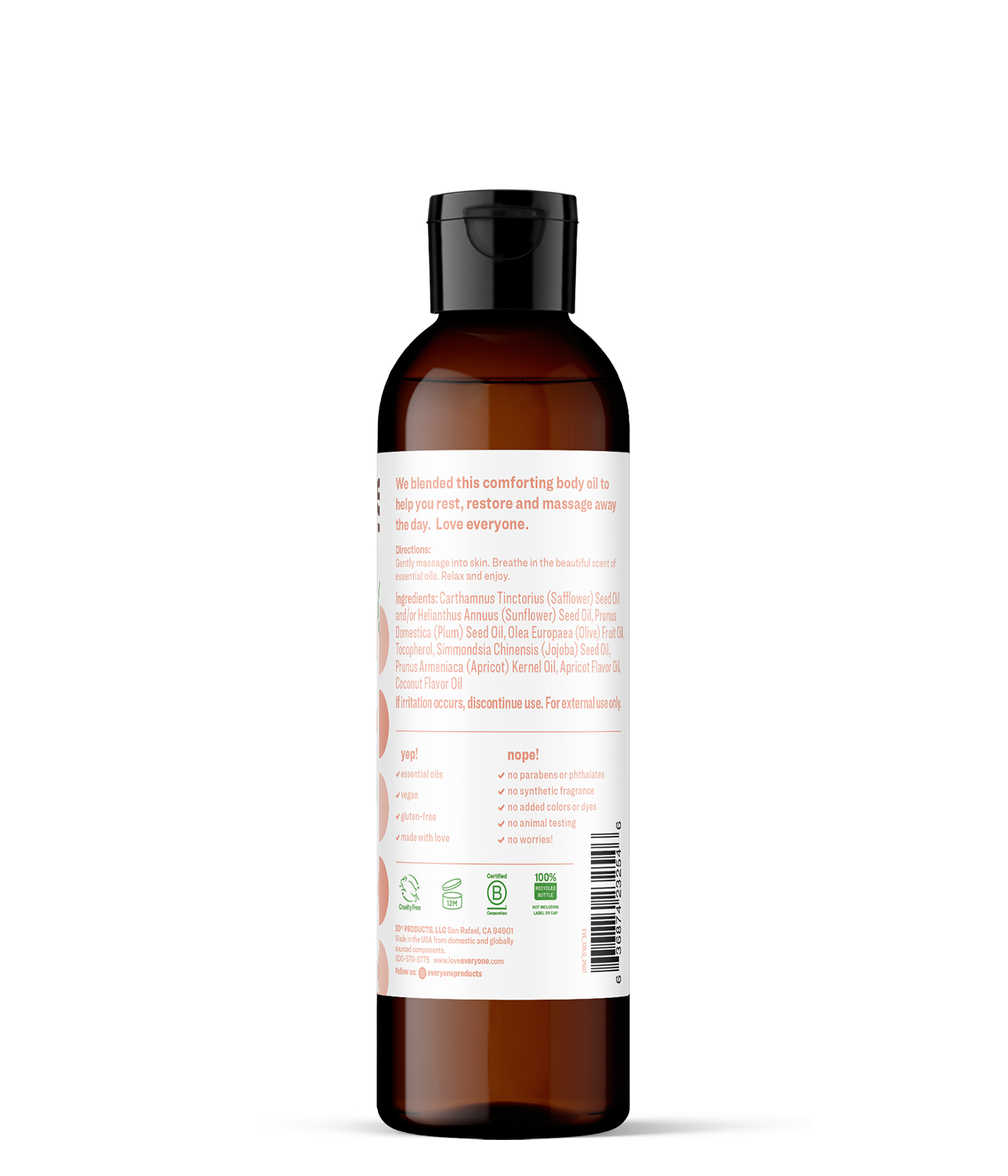 Our answer to the hustle and grind: a soothing body oil for all skin types. Because everyone needs rest and comfort. We blended antioxidant-rich plum oil and safflower oil for a luxurious base oil that absorbs easily into skin. Time for a sweet inhale - ahhh !