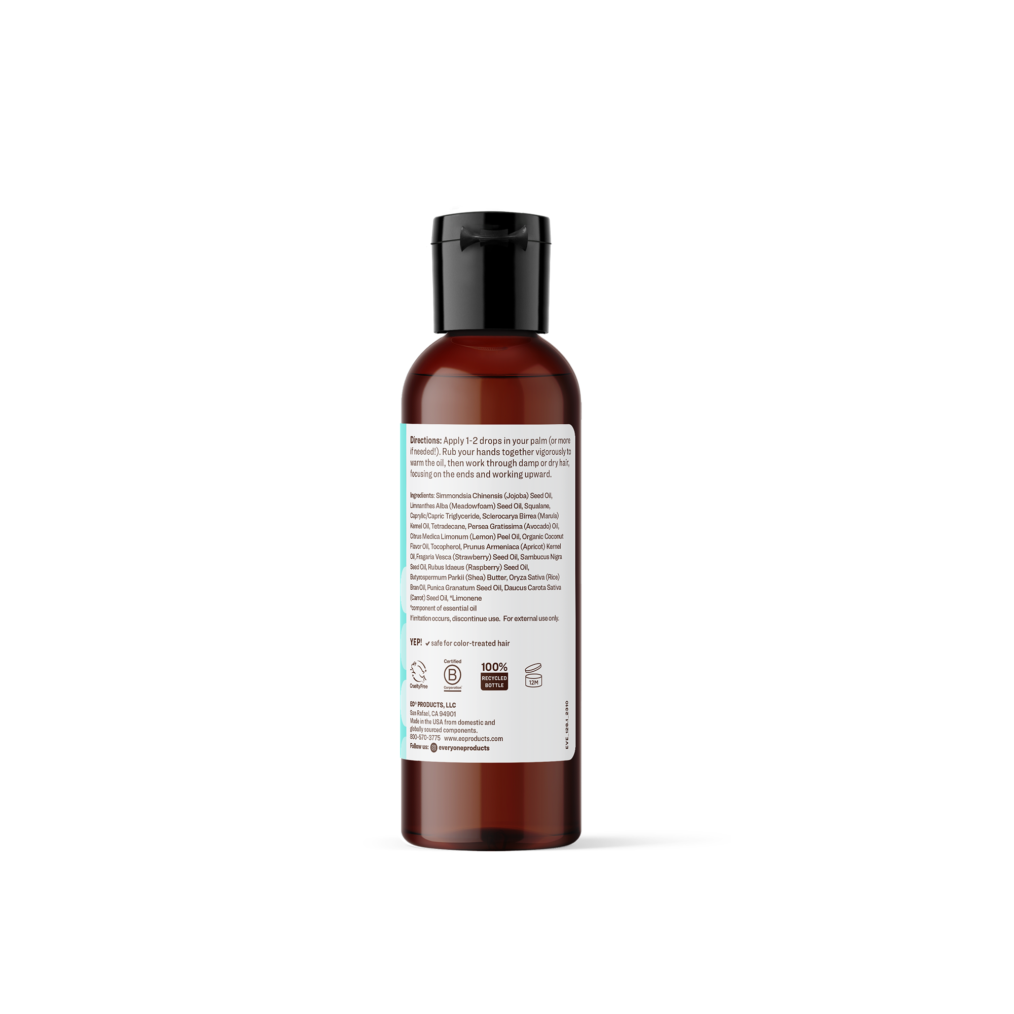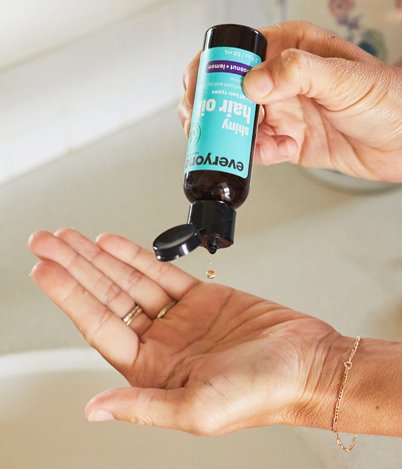 Apply one or two drops to your palm and rub hands together vigorously to warm oil, then work through damp or dry hair, focusing on the ends and working upward.