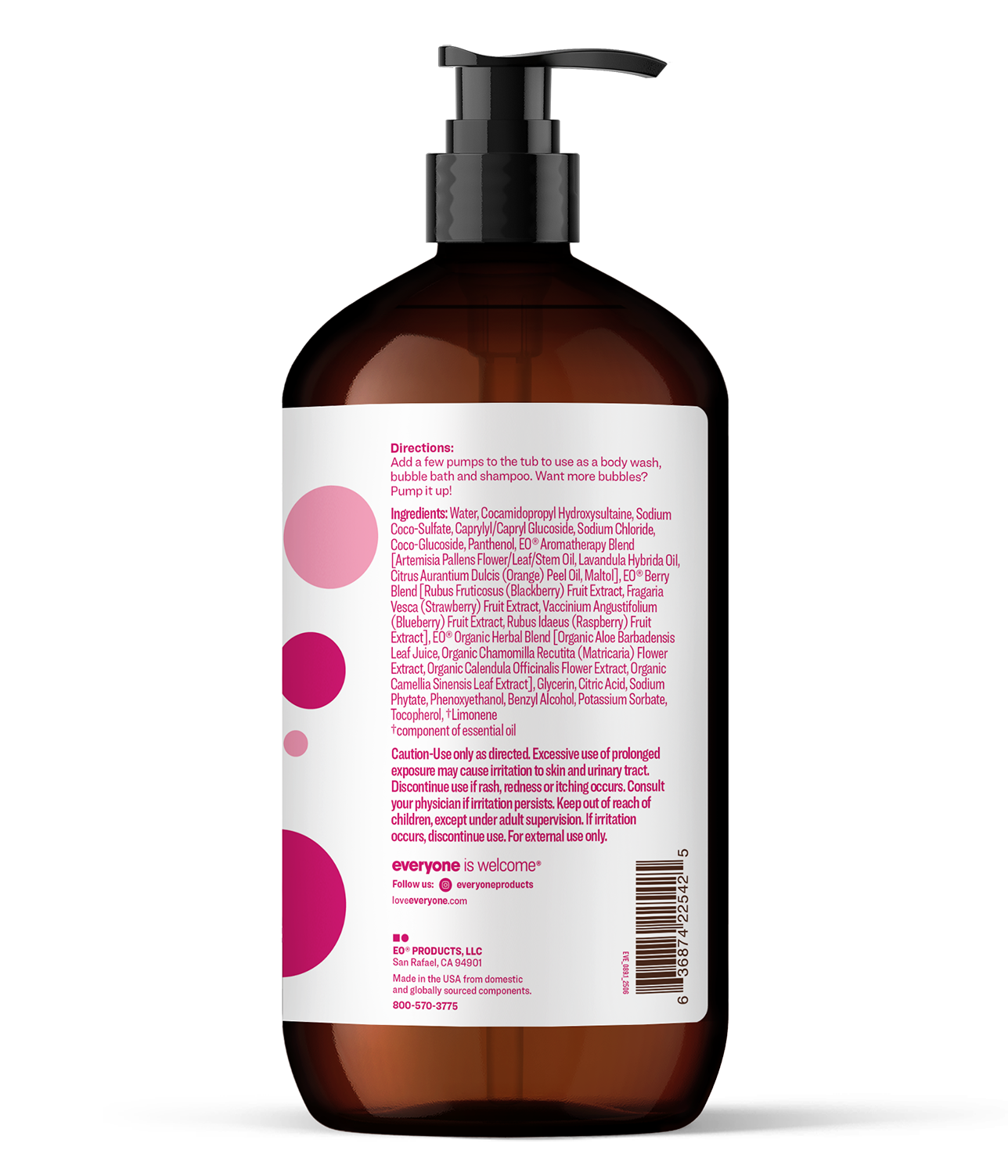 Water, Cocamidopropyl Hydroxysultaine, Sodium Coco-Sulfate, Caprylyl/Capryl Glucoside, Sodium Chloride, Coco-Glucoside, Panthenol, EO® Aromatherapy Blend [Artemisia Pallens Flower/Leaf/Stem Oil, Lavandula Hybrida Oil, Citrus Aurantium Dulcis (Orange) Peel Oil, Maltol], EO® Berry Blend [Rubus Fruticosus (Blackberry) Fruit Extract, Fragaria Vesca (Strawberry) Fruit Extract, Vaccinium Angustifolium (Blueberry) Fruit Extract, Rubus Idaeus (Raspberry) Fruit Extract], EO® Organic Herbal Blend [Organic Aloe Barbadensis Leaf Juice, Organic Chamomilla Recutita (Matricaria) Flower Extract, Organic Calendula Officinalis Flower Extract, Organic Camellia Sinensis Leaf Extract], Glycerin, Citric Acid, Sodium Phytate, Phenoxyethanol, Benzyl Alcohol, Potassium Sorbate, Tocopherol, †Limonene
