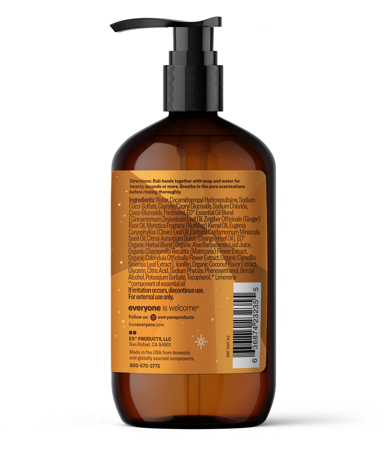 Water, Cocamidopropyl Hydroxysultaine, Sodium Coco-Sulfate, Caprylyl/Capryl Glucoside, Sodium Chloride, Coco-Glucoside, Panthenol, EO® Essential Oil Blend