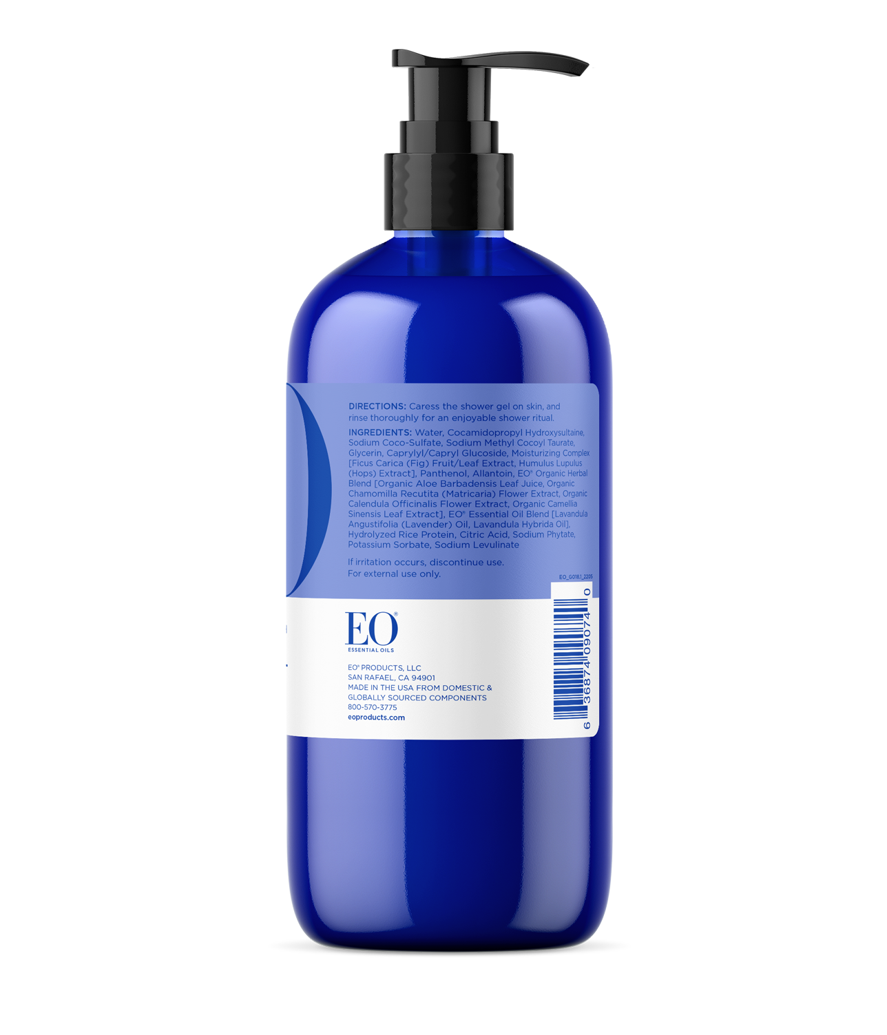 Water, Cocamidopropyl Hydroxysultaine, Sodium Coco-Sulfate, Sodium Methyl Cocoyl Taurate, Glycerin, Caprylyl/Capryl Glucoside, Moisturizing Complex [Ficus Carica (Fig) Fruit/Leaf Extract, Humulus Lupulus (Hops) Extract], Panthenol, Allantoin, EO® Organic Herbal Blend [Organic Aloe Barbadensis Leaf Juice, Organic Chamomilla Recutita (Matricaria) Flower Extract, Organic Calendula Officinalis Flower Extract, Organic Camellia Sinensis Leaf Extract], EO® Essential Oil Blend [Lavandula Angustifolia (Lavender) Oil, Lavandula Hybrida Oil], Hydrolyzed Rice Protein, Citric Acid, Sodium Phytate, Potassium Sorbate, Sodium Levulinate