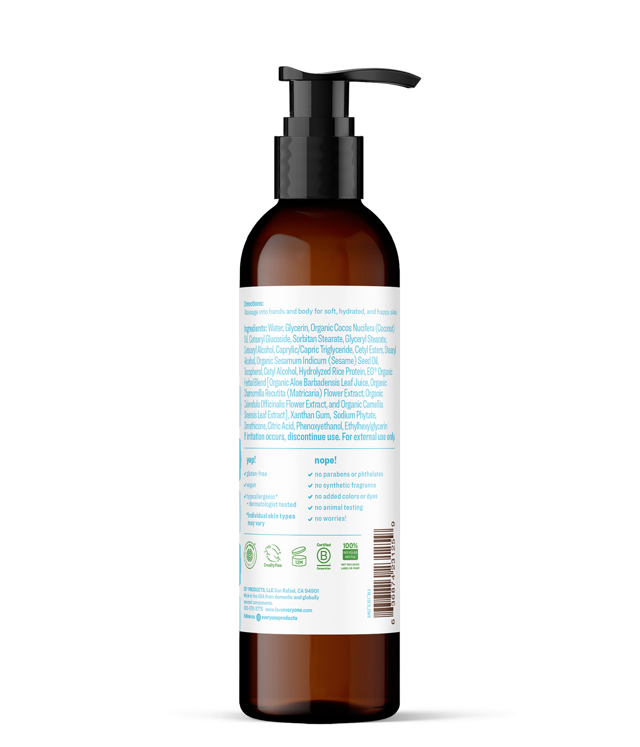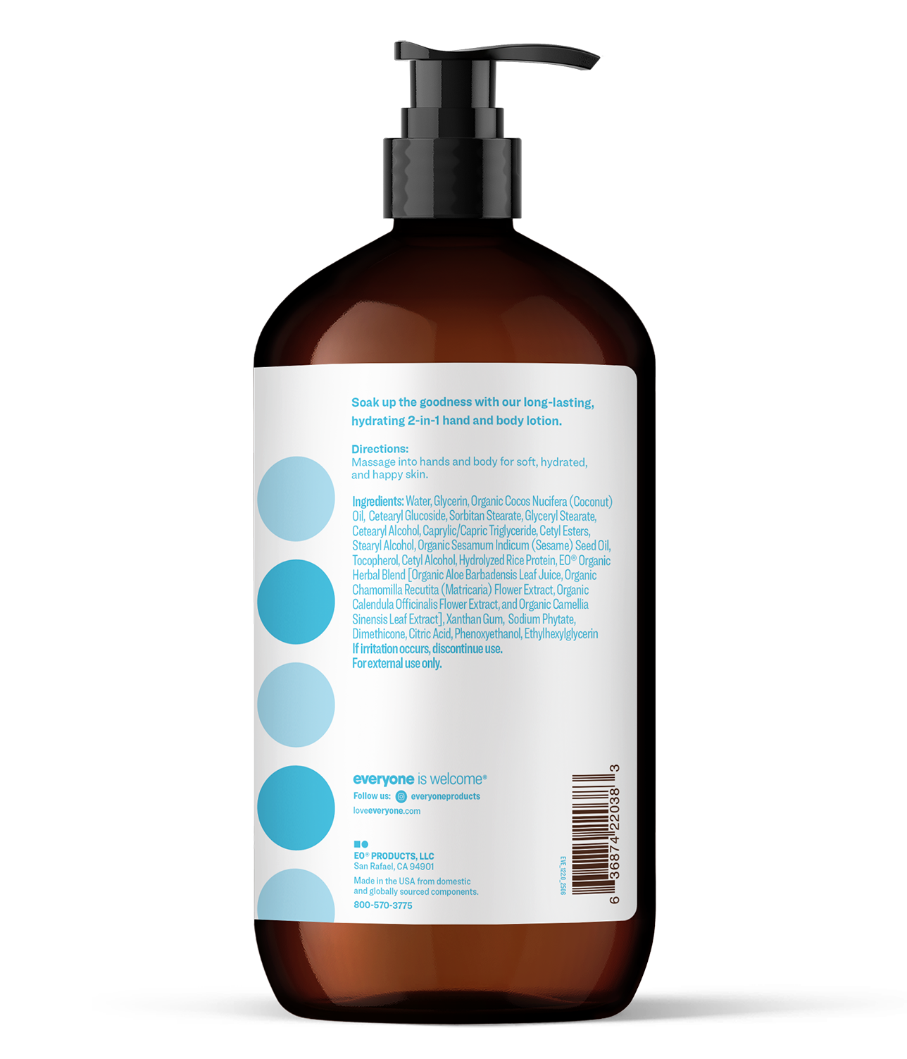 Water, Glycerin, Organic Cocos Nucifera (Coconut) Oil, Cetearyl Glucoside, Sorbitan Stearate, Glyceryl Stearate, Cetearyl Alcohol, Caprylic/Capric Triglyceride, Cetyl Esters, Stearyl Alcohol, Organic Sesamum Indicum (Sesame) Seed Oil, Tocopherol, Cetyl Alcohol, Hydrolyzed Rice Protein, EO® Organic Herbal Blend [Organic Aloe Barbadensis Leaf Juice, Organic Chamomilla Recutita (Matricaria) Flower Extract, Organic Calendula Officinalis Flower Extract, and Organic Camellia Sinensis Leaf Extract], Xanthan Gum, Sodium Phytate, Dimethicone, Citric Acid, Phenoxyethanol, Ethylhexylglycerin