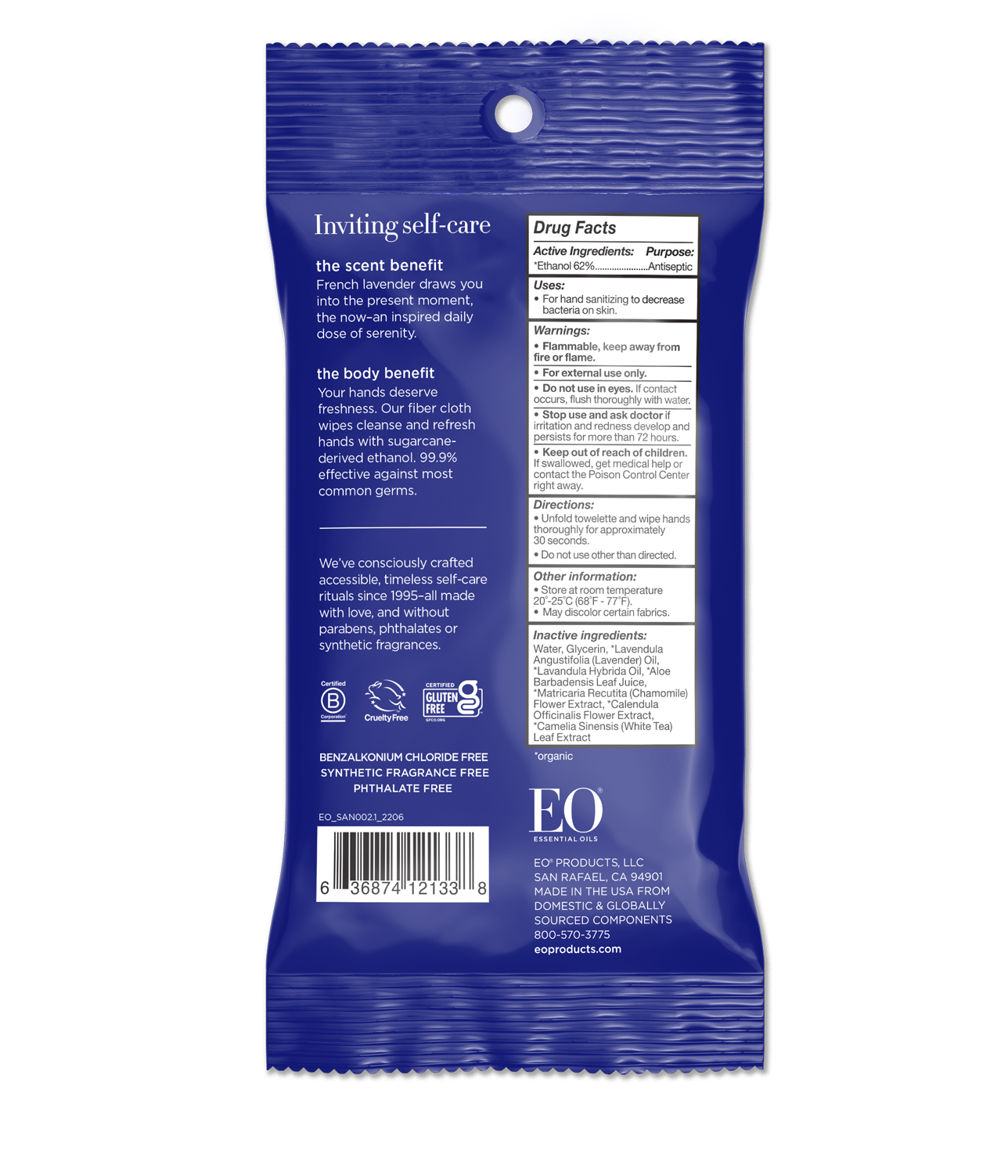 Keep hands clean and fresh with our lavender hand sanitizer wipes, 99.9% effective against most common germs, thanks to the 62% alcohol content. This resealable pack is perfect for on-the-go.